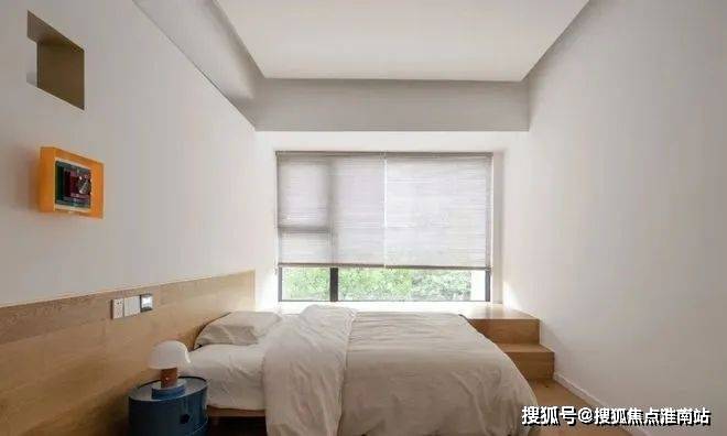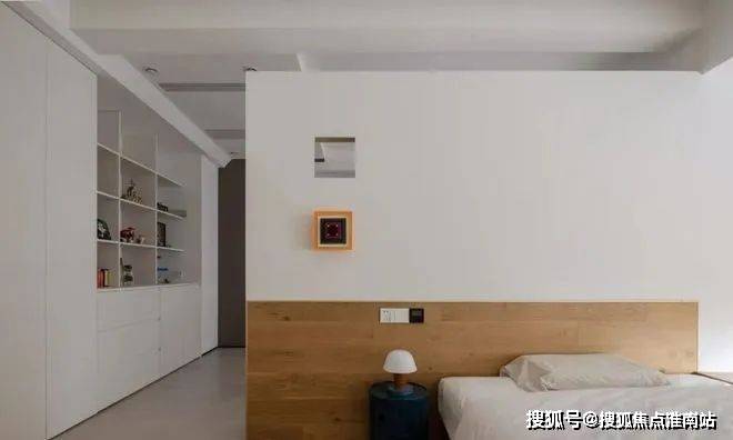 睡眠区与书房之间,用不到顶的墙体隔断,上方留空与右侧的方洞造型,增强两个空间的联系感。